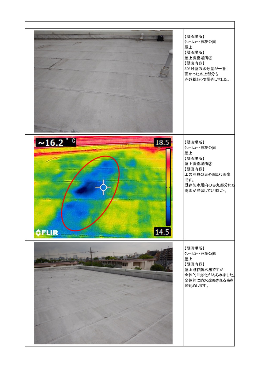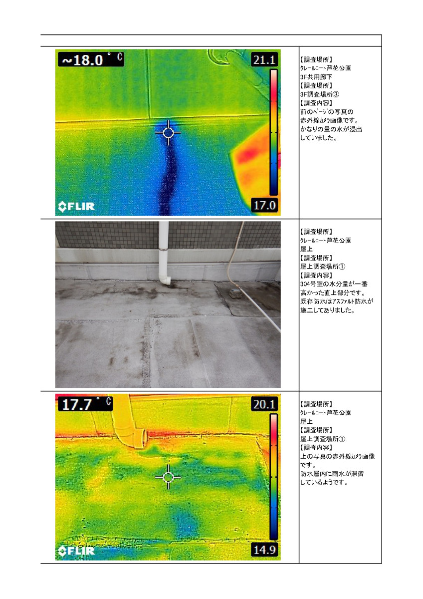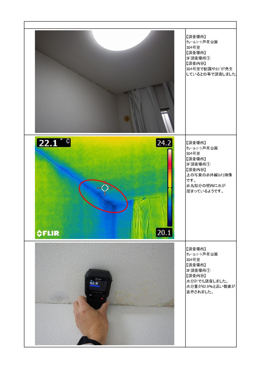 天井・壁面内に滞留している水分を赤外線カメラを使用して発見し、漏水原因を絞りこみます。