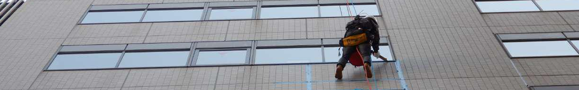 足場が組めない狭いスペースや高所でも施工が可能で、建物屋上からロープアクセスで垂直方向に降りながら、外壁調査・補修・清掃など幅広い業務を対応します。